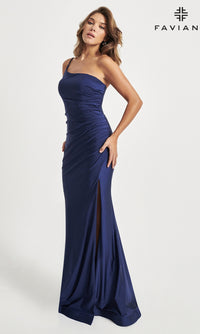 From Faviana, this beautiful one-shoulder long prom dress 11071 is ready to turn heads on your memorable evening. Whether you're going to prom, a fancy gala, or another formal event, this long designer dress flatters the figure from the asymmetrical neckline to the hem. In misses and plus sizes, this elegant evening gown has side ruching for a fitted look, while the long skirt opens in a side slit before pooling into a dramatic train. Defining femininity, this sophisticated one-shoulder long prom dress by Faviana is so chic for your special occasion.