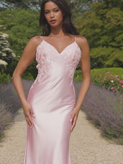 Slip into this sleek open-back long satin prom dress 11402 by Faviana and ignite the night. With delicate floral-lace applique on the v-neck bodice, this long designer dress gets an eye-catching look for prom, galas, and other formal events. Thin shoulder straps lead to the open back of this long v-neck formal dress, while matching floral-lace applique adorns the sides. The hip-skimming long skirt completes the look of this open-back long satin prom dress that will have you looking like a total knockout from the moment you make your entrance.