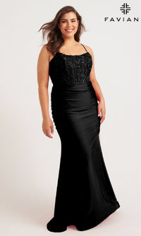 Sexy plus-size prom dress with a beaded corset bodice and ruching through the hips and back to highlight your curves. This stretch charmeuse form-fitting long prom dress has adjustable spaghetti straps and a horsehair hemline.