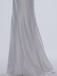 A woman stands against a white background wearing the Long Stretch-Satin Beaded Prom Dress by Faviana, a white floor-length gown with thin straps, rhinestone embellishments, a fitted silhouette, and an elegant front slit.