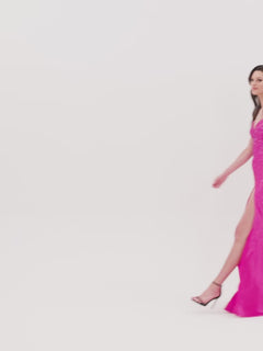 A woman wears the Long Stretch-Satin Beaded Prom Dress by Faviana—this sleeveless, floor-length bright pink gown features a thigh-high slit and dazzling beaded embellishments, as she stands smiling against a plain background.