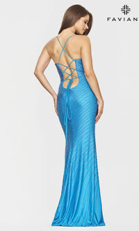 In gorgeous sea blue, this long beaded prom gown is as beautiful as it is elegant. From Faviana, this gorgeous long designer dress has sparkly tonal beading from the v-neckline to the floor for a dazzling look at prom, fancy galas, and other formal events. The long blue evening gown has thin shoulder straps that create a trendy corset detail as they criss-cross the open back. A banded empire waist creates a long, lean look on this long formal dress, while the hip-skimming skirt opens in a side slit before reaching a dramatic floor length. Catch the spotlight and shine all night in this sea blue long beaded prom gown from the designers at Faviana.