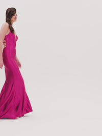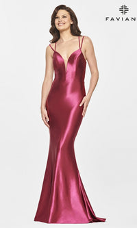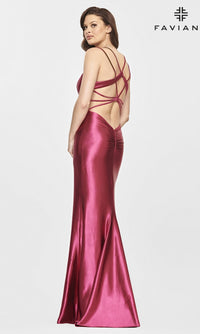 In vibrant raspberry red, this long formal dress is a polished style in gleaming stretch satin. From Faviana, this gorgeous long designer dress, style number FA-S10810, smooths over the curves from the plunging v-neckline to the floor for a glamorous look at prom, military balls, and other fancy formal events. Double shoulder straps criss cross over the open back before beautifully framing the diamond-shaped cut-out detail. The long satin evening gown has booty-shaping ruching in the back, while the hip-skimming long skirt flows to the floor in a trendy mermaid shape. An upscale style with plenty of shimmer, this raspberry red long formal dress by Faviana is for the savvy girl with a flair for fashion.