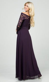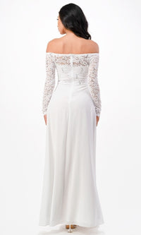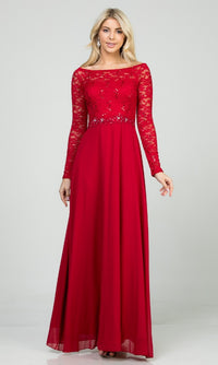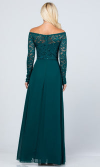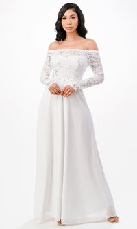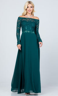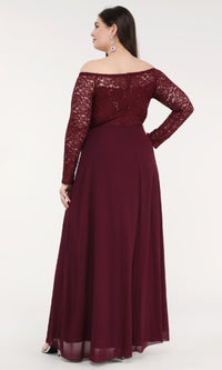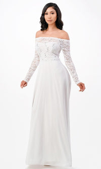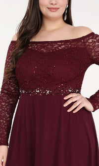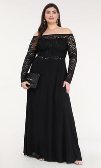 Plus-size long formal dress with a lace bodice, off-the-shoulder neckline, long sleeves, a beaded waistline, and an a-line skirt.