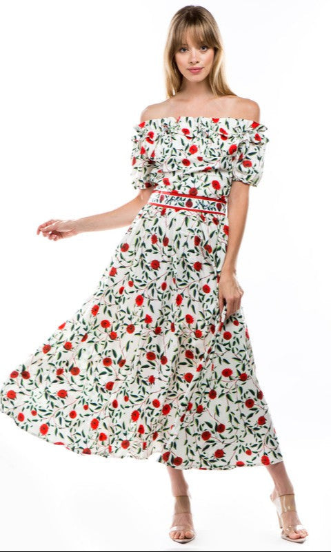 Off-the-shoulder floral print casual maxi dress with short sleeves and an a-line skirt.