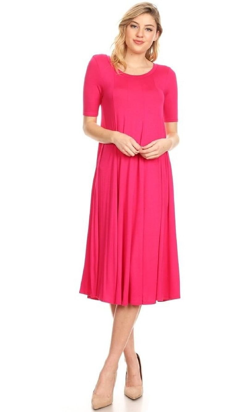 Oversized a-line casual jersey knit dress with short sleeves and a round neckline.