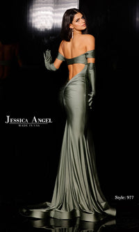 Simply sensational, this off-the-shoulder long mermaid prom dress 977 is a celebration of romance and exotic style. With an off-the-shoulder sweetheart neckline, this long designer dress by Jessica Angel has banded sleeves that drape over the upper arms. Elbow-length gloves add an upscale look to this long formal dress, while the long mermaid skirt has a small train that adds to the drama. Made in the USA, this off-the-shoulder long mermaid prom dress is an upscale choice for prom, galas, and other formal events.