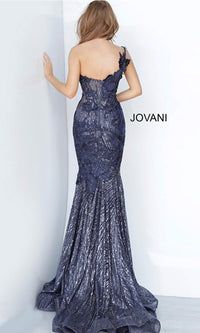 Showcase an upscale look in this one-shoulder long glitter prom dress 02445 from Jovani. No one will soon forget the moment you make your entrance in this gorgeous one-shoulder long formal dress with embellished glitter-mesh fabric from the sweetheart neckline to the hem. Lace appliques at the one-shoulder strap flows to the back of this long designer dress, while a sheer corset wraps around the waist for a alluring look at prom, pageants, and other black-tie events. In misses and some plus sizes, this long glitter prom dress has a mermaid skirt that shows off the hips before draping to the floor to finish the design. Embrace contemporary elegance when you attend your memorable event in this one-shoulder long glitter prom dress from Jovani.