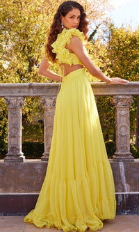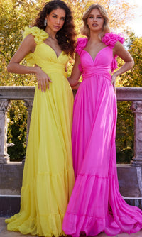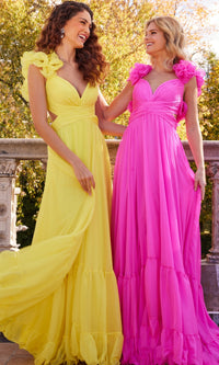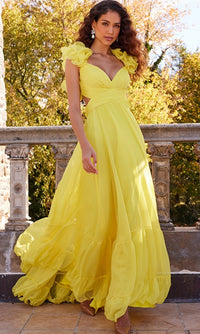 Sweetly feminine, this long tiered Bohemian-style prom dress 23322 is sure to leave an indelible mark on our hearts. With a criss cross sweetheart bodice, this long tiered designer dress features soft ruffled shoulders that lead to the cut-out back for a sweet and sassy look at prom, galas, and other fancy events. Offered in misses and some plus sizes, this long a-line formal dress has a full and fabulous long a-line skirt that flows to the floor in ruffled tiers. No one will soon forget this long tiered Bohemian-style prom dress that is sure to transform you into a Southern belle for your memorable evening.