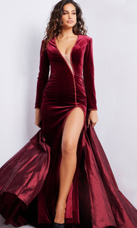 Here's a gorgeous long sleeve long velvet formal dress 23943 that is sure to give your look a spectacular elevated edge. Crafted in soft velvet from the asymmetrical deep v-neckline to the floor, this long sleeve evening gown gets a style upgrade with long sleeves and a gleaming taffeta overskirt that flows to the hem with the look of a dramatic train. The exotic long velvet dance dress has embellished trim at the cuffs of the long sleeves and at the deep v-neckline that flows down to the thigh-high side slit before ending at the floor. Strike an elegant pose at galas, military balls, and other formal events and know you look red-carpet ready in this gorgeous long sleeve long velvet formal dress from Jovani.