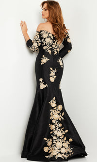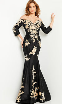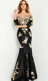 Eye-popping bright gold flowers make this long black formal dress 24327 a gorgeous work of art for your big dance. Whether you're going to prom, a fancy gala, or another formal event, this long gold and black designer dress is sure to impress. Along with gold floral embroidery from the sweetheart neckline to the hem of this beautiful long black evening gown, chic three-quarter sleeves create a vintage vibe that the crowd will love. Smoothing over the hips, the long gold and black mermaid skirt ends at a dramatic floor length to finish the look of this long black formal dress from Jovani.