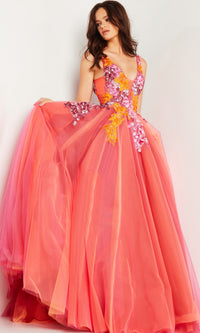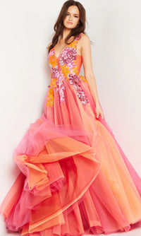 Bright, bold, and beautiful, this long orange prom ball gown 25800 is ready to leave an indelible mark on hearts and memories. In various shades of orange, this long a-line formal dress includes multi-colored embroidered floral designs from the v-neckline to the hips, while a deep v-back adds a bit of intrigue for prom, galas, and other black-tie events. The long orange designer dress has a fully-lined long skirt with a sheer tulle overlay that flows to the floor in a voluminous a-line shape that is sure to elevate your evening look. The perfect balance of elegance and in-your-face bold design, this long orange prom dress is a celebration of timeless beauty and statement-making bright style.