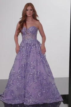 In soft lilac purple, this strapless long prom ball gown 26223 is as sparkly as it is beautiful . The long purple strapless formal dress has dazzling sequin prints from the sweetheart neckline to the hem, while a sheer corset waist wraps around to the back for a flirty look at prom, galas, and other black-tie events. Offered in misses and some plus sizes, this sequin-print long evening gown has a fully-lined long skirt with a sheer sequin-print overlay that flows to the floor in a full and fabulous a-line shape. Fit for the red carpet, this gorgeous strapless long purple prom ball gown is one that the crowd will not soon forget.
