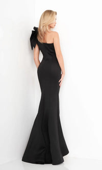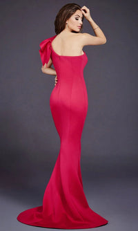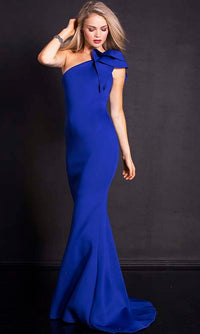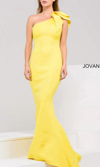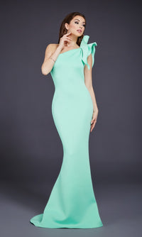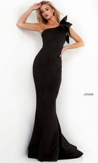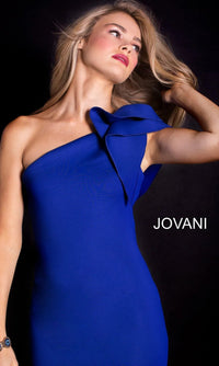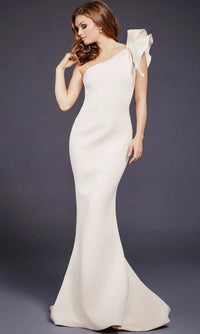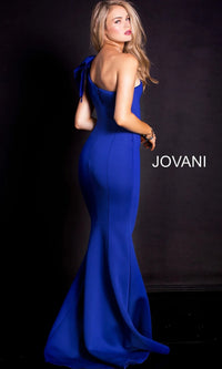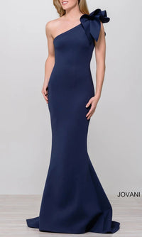 One-shoulder mermaid dress by Jovani made of scuba fabric featuring an asymmetrical neckline, a unique ruffle detail for one shoulder, a short sweep train, and a back zipper closure. The dress is perfect for bridesmaids, prom, or as a wedding guest.