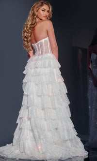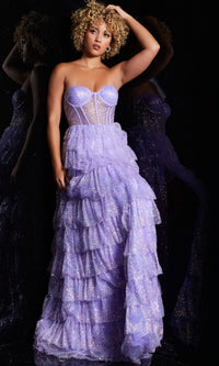 Double takes are sure to be yours in this long lilac ruffled prom gown 38165 from Jovani. Simply gorgeous for prom, galas, and other formal events, this strapless sweetheart long lilac designer dress features sparkly embellishments from the sheer bodice to the hem. The long ruffled purple formal dress has a sparkly a-line skirt that flows to the floor in tiered ruffles, while a side slit adds a touch of sexy to this already stunning gown. Bring your romantic visions to life when you slip into this long lilac ruffled prom dress that is sure to be the star of the show.