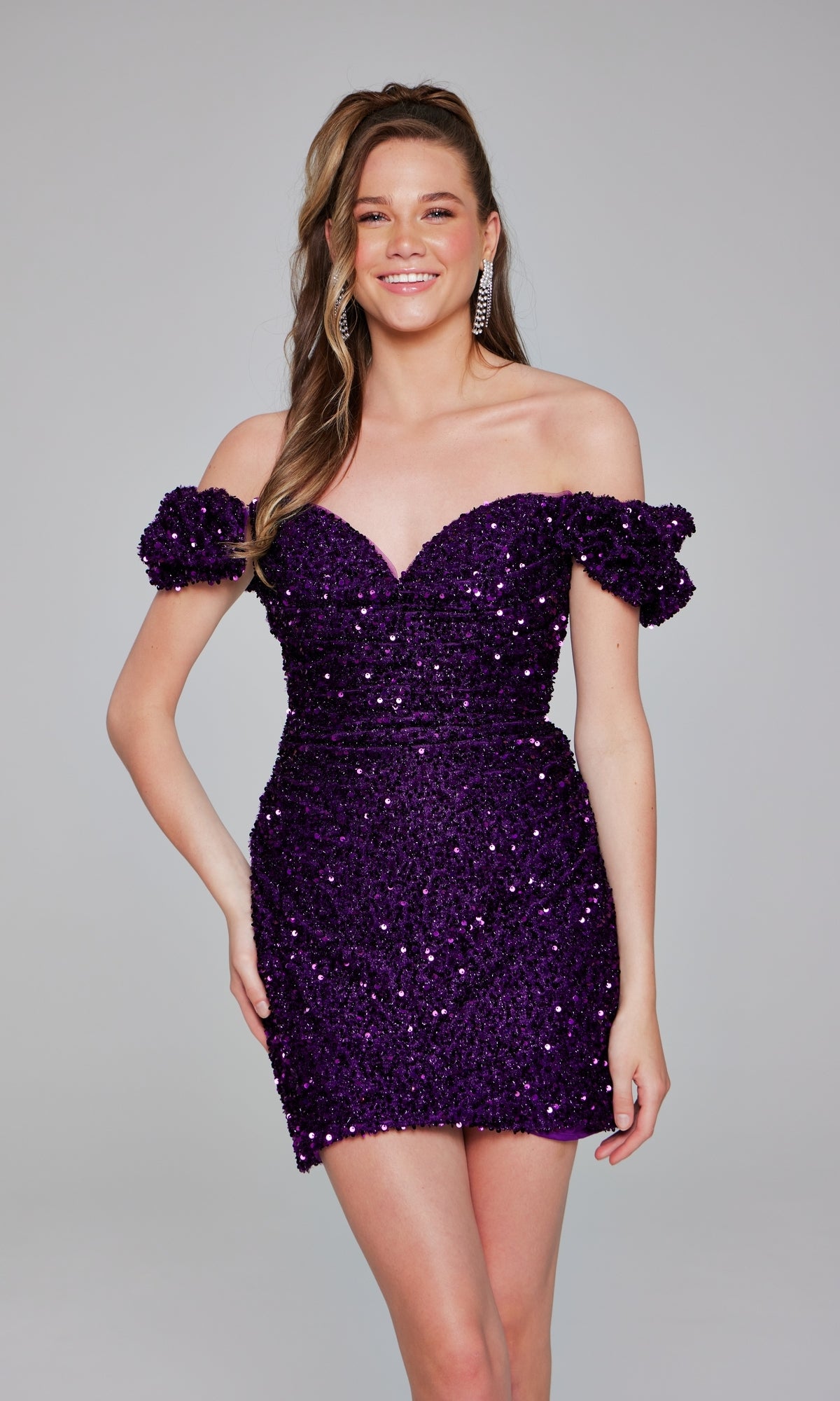 Stand out in a crowd wearing this off-the-shoulder short sequin homecoming dress 39631 from Jovani. With shimmering beading and scattered sequins from the sweetheart neckline to the hem, this off-the-shoulder short cocktail dress is sure to shine in the spotlight whether you are attending homecoming, a wedding reception, or another semi-formal event. In misses and some plus sizes, this short sequin party dress has wide banded sleeves that shimmer as they drape over the upper arms, while the mini skirt hugs the hips before ending well above the knees. For a glamorous look at your big celebration, slip into this off-the-shoulder short designer homecoming dress from Jovani.