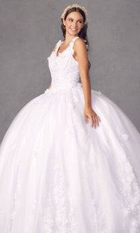 In this traditional white quinceañera dress, you can dance the night away with radiant elegance. Gorgeous swirls of beaded embroidery enhance the classic sophistication of this dress, while pops of 3-D flowers add a sweet and chic edge to the style. The wide straps on this embroidered sleeveless quince dress become embellished double straps are they round the shoulders and secure near the lace-up back detail. Glitter on this v-neck ball gown quinceañera dress provides a final shimmering touch that will have you shining under the birthday spotlight.