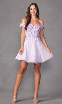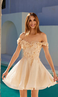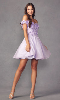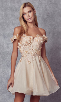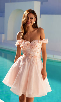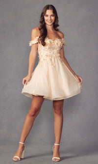 Beautiful 3-D flowers make this short homecoming dress as unique as it is captivating. The sweet off-the-shoulder short a-line party dress includes sparkly floral designs on the bodice and on the banded sleeves that flow to the back for an irresistible look at homecoming, sweet-16 parties, and other semi-formal events. The short dance dress has a fully-lined short skirt with a sheer shimmer overlay that flows to the hemline in an a-line shape to complete the look. Affordably priced under $150, this off-the-shoulder short homecoming dress is as adorable as it is budget friendly.