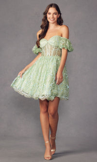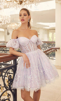 Sweet and sparkly, this off-the-shoulder short prom dress is uniquely beautiful for prom, sweet-16 parties, and other semi-formal events. Shimmering glitter designs adorn this short a-line party dress from the sweetheart neckline to the hem, while short puff sleeves drape alluringly over the upper arms. A sheer corset-style waist wraps around to the back of this short glitter prom dress, while thin bands lace up for the best fit. Offered in misses and plus sizes, this short party dress has a fully-lined short skirt with a sheer-glitter overlay that flows to the scalloped hemline in an a-line shape. For the girl who loves an upscale design at an affordable price, this off-the-shoulder short prom dress is priced under $150.