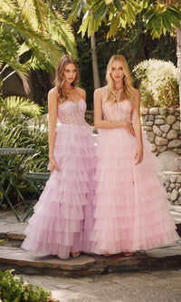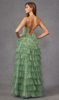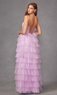 Dazzle in this ruffled glitter tulle prom dress. Stunning tiers of ruffled glitter tulle fabric cascade down from the waistline of this sheer corset prom dress. The illusion sweetheart bodice boasts a breathtaking display of floral beaded and sequined embroidery that provides just the right amount of coverage. A lace-up detail over the open back provides an adjustable fit in this tiered prom dress, and a side slit in the a-line skirt adds the final dramatic touch. Dance the night away in this ruffled glitter tulle prom dress.