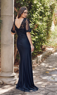 Behold the beauty of this short sleeve long prom dress by Juliet. With sheer elbow-length short sleeves, this long formal dress has sparkly beaded embroidery from the deep v-neckline to the hips. A deep v-back adds a sexy vibe to this long evening gown, while the hip-hugging long skirt opens in a side slit to add to the stand-out look for prom, galas, and other formal events. Offered in misses and plus sizes, this short sleeve long prom dress, under $250, is as affordable as it is glamorous.