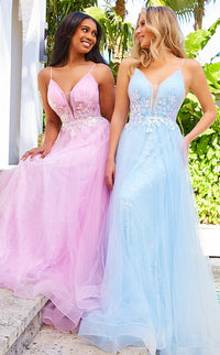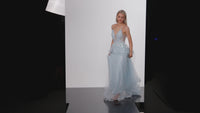 A vision in light blue, this long a-line prom dress is a breathtaking style by the designers at JVN by Jovani. The stunning long blue evening gown features a plunging v-neck bodice with lovely 3D embroidered flowers that flow down past the waist. Thin shoulder straps transfer to the low v-back of this fabulous long formal dress for a look of allure every time you turn around. Fully-lined, the long sparkly skirt has a sheer tulle overlay that flatters the figure as it flows to the floor in an a-line shape. A striking choice for prom, military balls, and other formal events, this JVN by Jovani is a traditional style with modern-day details.