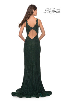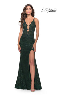 This long lace prom dress is an exquisite style for the glam girl with upscale taste. From the designers at La Femme, this deep v-neck evening gown includes a sheer-lace bodice with sturdy shoulder straps that lead to the cut-out back detail. The fabulous long designer formal dress includes a fully-lined long skirt with a sheer-lace overlay that smooths over the hips before opening in a side slit and pooling into a dramatic small train. A contemporary style with eye-catching details, this La Femme long lace prom dress breaks free of everyday options for a refined look at prom, galas, and other formal events.