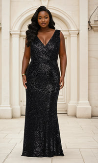 La Femme Plus-Size V-Neck Sequin Long Prom Dress