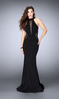 High neck sheer cut out La Femme gown in jersey