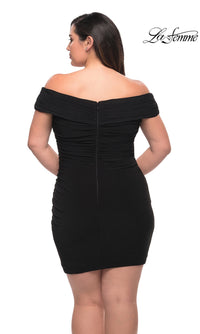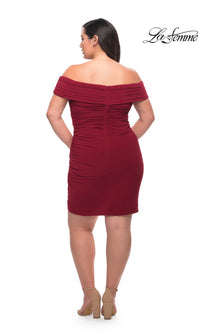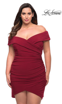 Your search for the perfect sexy plus-size cocktail party dress is finally over. From La Femme, this gorgeous short designer dress is in plus sizes so that endless compliments are sure to come your way if you choose to slip it on for homecoming, wedding receptions, and other semi-formal events. The sexy short dress has ruched off-the-shoulder banded sleeves that start at the v-neckline and wrap around the arms for a look of romance. Side ruching offers a fitted look to this plus-size party dress, while a tulip-style hem adds an edgy twist to complete the look. Get ready for endless compliments when you choose this plus-size short cocktail party dress by La Femme.