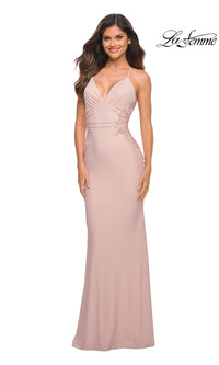 A real curve-hugging style, this long jersey formal gown is a statement-making dress. From the designers at La Femme, this v-neck evening gown has sparkly lace on the sides that leads to the sheer back for a flirty look at prom, fancy galas, and other formal events. The long designer dress is crafted in soft jersey from the v-neckline to the hem, while thin shoulder straps criss cross the open back for a sexy vibe with every turn. The hip-skimming long skirt offers a stunning look before draping to a dramatic floor length that completes the design. Make your night a dazzling one in this long jersey formal gown from La Femme.