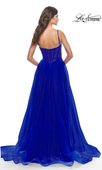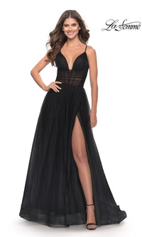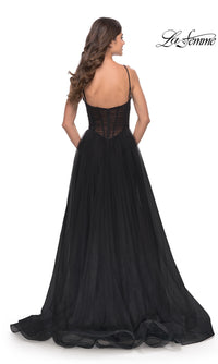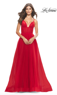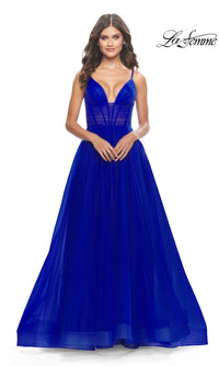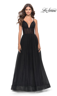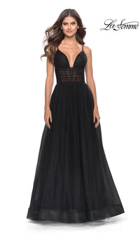 Full and fabulous, this long prom ball gown is a traditional style with up-to-the-minute details. From La Femme, this gorgeous long designer dress features a deep v-neckline and a corset-style sheer-tulle waist that wraps around to the back. The long formal dress has a floor-length long skirt that gathers at the waist before opening in a side slit and draping to the floor in a voluminous a-line shape. So impressive for prom, galas, and other formal events, this long prom ball gown by La Femme is sure to steal the show on your memorable evening.