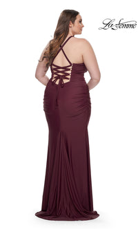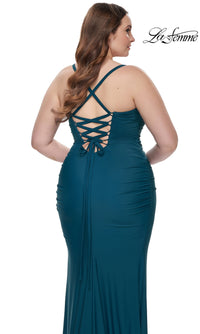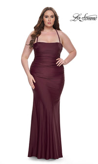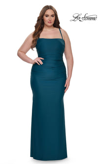 Sleek and sultry, this plus-size long prom dress is sure to turn up the heat at your formal event. From La Femme, this long designer dress 32195 gets a fitted look with thin shoulder straps that attach to the corset detail that laces up over the open back. Smoothing over the curves from the straight neckline to the floor, this plus-size long formal dress is a sensational choice for prom, galas, and other black-tie events. A simple, yet sophisticated choice for your memorable evening, this plus-size long prom dress is one you'll want to wear again and again.