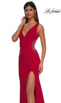 Open back prom dress by La Femme made from a comfortable jersey fabric that hugs the figure and features a sleeveless v-neck bodice.