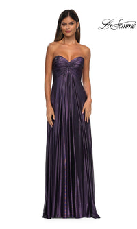In gleaming metallic fabric, this beautiful strapless sweetheart long prom dress 33047 is a stand-out look for your big formal. From La Femme, this floor-length long designer formal dress has a twist-front empire-waist bodice that flatters the figure for prom, galas, and other black-tie events. The strapless long metallic evening gown has a full and fun a-line skirt that flows to the floor for a figure-flattering look. Offered in misses and some plus sizes, this strapless sweetheart long prom dress is sure to bring your romantic visions to life.