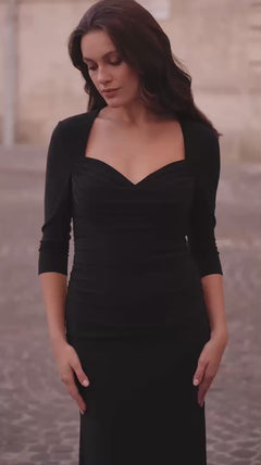 Here's a long black jersey formal dress 33135 by La Femme that is as figure flattering as it is beautiful. With three-quarter long sleeves and a ruched sweetheart bodice, this long black special-occasion dress is ready for you to proudly step into the night. Offered in misses and some plus sizes, this long black designer dress has a long skirt that smooths over the hips before ending in a small train. Offering a classic look with modern details, this long black jersey formal dress is ready to charm the crowd.
