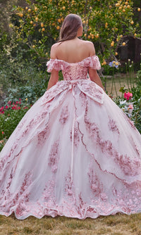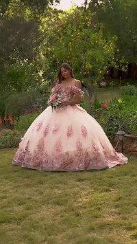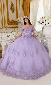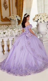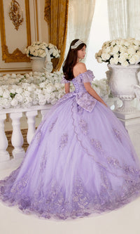 Here's a ball gown quinceañera dress that's gracefully feminine. Ruffling beautifully around the arms, the daintily scalloped off-the-shoulder sleeves are simply charming. Accented by 3-D floral appliques, a dazzling glitter print on this off-the-shoulder quinceañera dress embellishes the sweetheart bodice and layered skirt. Topping the parting layer of the poofy skirt on this glitter quince dress, a bold and beautiful back bow rests just below the chic lace-up corset feature. Bring out your inner princess on your birthday when you wear this luxurious quince ball gown.