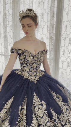 Shine in this off-the-shoulder quinceañera dress with gold embroidery. Creating a regal pattern across the sweetheart bodice and around the poofy skirt in two layers, embellished golden embroidery enhances the sparkle of this glitter quince dress. The lace-up back easily adjusts for the perfect fit in this quince ball gown. Make a lasting, glamorous impression when you wear this ball gown quinceañera dress.
