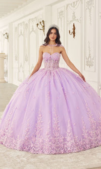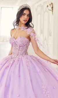 Strapless quinceanera ball gown dress by Ladivine featuring a structured corset bodice with boning, floral lace applique, and a removable tulle cape that ties around the neck.