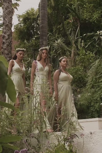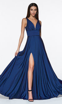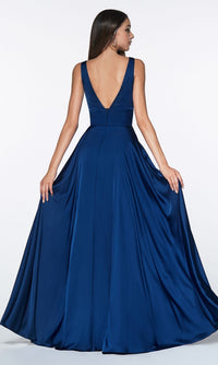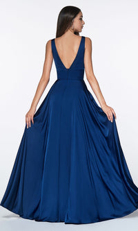 Classic charm with a flirty edge, this long prom dress is both flattering and versatile. In soft satin from the sleeveless v-neck bodice to the hem of the flowy floor-length skirt, this a-line prom dress is simply dreamy. The open back of this satin prom dress mirrors the low v-neckline for a visually slenderizing look. The wide empire waistband flatters, and the sultry side slit makes walking a dancing a breeze. Perfect for prom, weddings, and other formal celebrations, this empire-waist classic prom dress adapts beautifully to so many events.