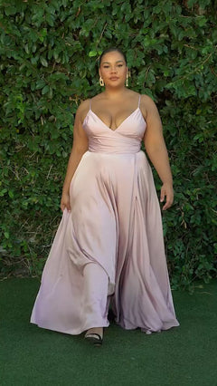 Here's a beautiful plus-size long a-line prom dress that is a great find for the budget-minded fashionista. An upscale design for prom, fancy galas, and other formal events, this plus-size long evening gown is surprisingly priced under $150. Crafted in gleaming fabric from the deep v-neckline to the hem, this plus-size long formal dress has thin adjustable shoulder straps that lead to the low back, while the faux-wrap long a-line skirt drapes to the floor to finish the figure-flattering look. Celebrate your big night without breaking the bank when you choose this plus-size long a-line prom dress that is as affordable as it is beautiful.