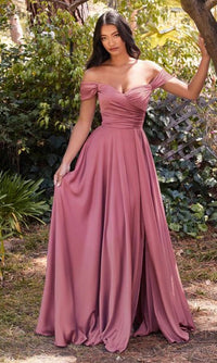 So romantic, this off-the-shoulder long prom dress is a classic style with beautiful details. So sweet for prom, military balls, and other formal events, this floor-length evening gown is crafted in soft satin fabric from the surplice v-neckline to the hem, while banded sleeves flow over the upper arms for a captivating look. A ruched waist offers a fitted look to this long formal dress, while the long skirt flows to the floor in a flattering a-line shape. Priced under $150, this budget-friendly off-the-shoulder long prom dress is sure to make a classic fashion statement without busting your bank account.
