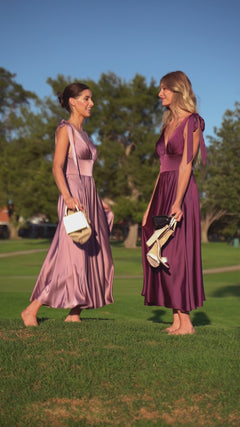 Fun and fabulous, this tea-length wedding-guest dress 7499 is sure to be a new favorite. So cute for weddings, fancy dinner parties, and other semi-formal to formal events, this sweet a-line midi dress has a v-neck bodice with shoulder ties that hang down over the upper arms. In misses and some plus sizes, this pretty semi-formal dress has a wide empire waist that tops the gleaming skirt as it flows to a below-the-knee hemline in a figure-flattering a-line shape. Surprisingly affordable, at under $100, this tea-length wedding-guest dress is a one-of-a-kind creation that lets your beauty shine through.