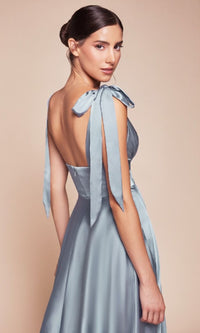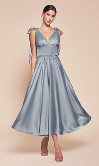 Fun and fabulous, this tea-length wedding-guest dress 7499 is sure to be a new favorite. So cute for weddings, fancy dinner parties, and other semi-formal to formal events, this sweet a-line midi dress has a v-neck bodice with shoulder ties that hang down over the upper arms. In misses and some plus sizes, this pretty semi-formal dress has a wide empire waist that tops the gleaming skirt as it flows to a below-the-knee hemline in a figure-flattering a-line shape. Surprisingly affordable, at under $100, this tea-length wedding-guest dress is a one-of-a-kind creation that lets your beauty shine through.