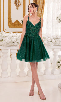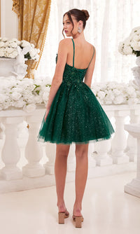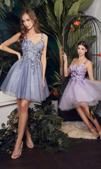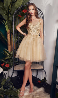 Cute and sparkly, this short a-line homecoming dress shimmers with metallic lace. The beautiful short party dress features metallic-lace flowers on the v-neck bodice for a dazzling look at homecoming, sweet-16 parties, and other semi-formal events. The fancy short dance dress has more metallic flowers that flow past the waist and onto the multi-layered short baby-doll-style skirt. The fully-lined skirt has a sheer shimmer tulle overlay that flows to the hem in an a-line shape that flatters the figure to complete the look. Richly designed for the girl who loves to stand out, this short a-line homecoming dress defines femininity while shining in the spotlight.