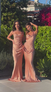 Stand out in a crowd in this cowl-neck long prom dress that is as dramatic as it is affordable. Budget-priced under $100, this long formal dress features upscale details without the upscale price for prom, fancy wedding receptions, and other red-carpet events. With a cowl neckline, this long evening gown has two different style shoulder straps that lead to the deep v-back where a drape flows diagonally from one shoulder to the hip. With ruching at the side, the long mermaid skirt flows to the floor to complete the look of this cowl-neck long prom dress that offers a sophisticated look that won't wreck your bank account.