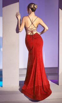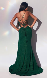 For the girl who loves to sparkle, this empire-waist long glitter prom dress is sure to shine. An eye-catching choice for prom, military balls, and other formal events, this tight glitter evening gown is crafted in glittery fabric from the v-neckline to the hem, while thin shoulder straps cross over the open back before attaching to the corset detail that laces up for the best fit. The open-back formal dress has an empire waist that offers a long, lean look, while the hip-hugging long skirt opens in a side slit before reaching a dramatic floor length. At under $200, this richly designed long glitter prom dress is surprisingly affordable and nothing short of fabulous.