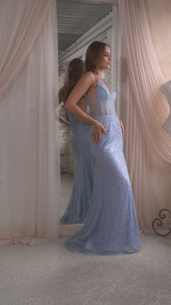 Simply jaw-dropping, this long glitter prom dress CC2167 is as gorgeous as it is affordable. At under $200, you can get this amazing long glitter prom dress with sparkly floral details from the sheer corset-style bodice to the hem. With a deep v-neckline, sheer sides and matching deep v-back, this long glitter evening gown gets a sexy vibe for prom, galas, and other black-tie events. The fully-lined long skirt opens in a side slit before ending with a dramatic train to complete the look of this richly-designed long glitter prom dress that is a head-to-toe stunner for your big night.