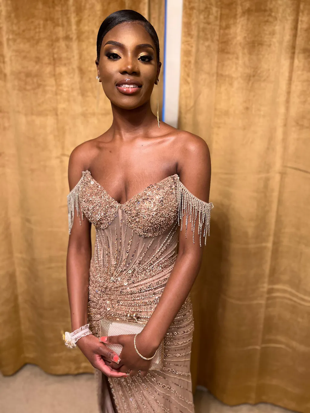 A woman stands indoors on a tiled floor wearing the Ladivine CC324 Fringed Long Beaded Prom Dress—an eye-catching black, off-the-shoulder gown with sequins, fringe accents, and a thigh-high slit.