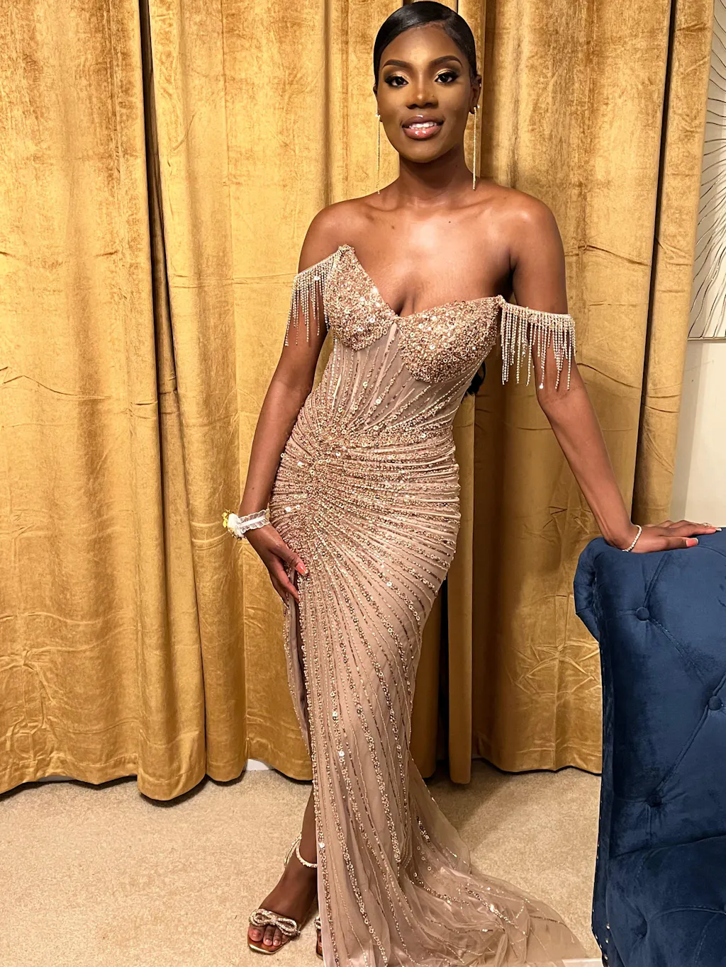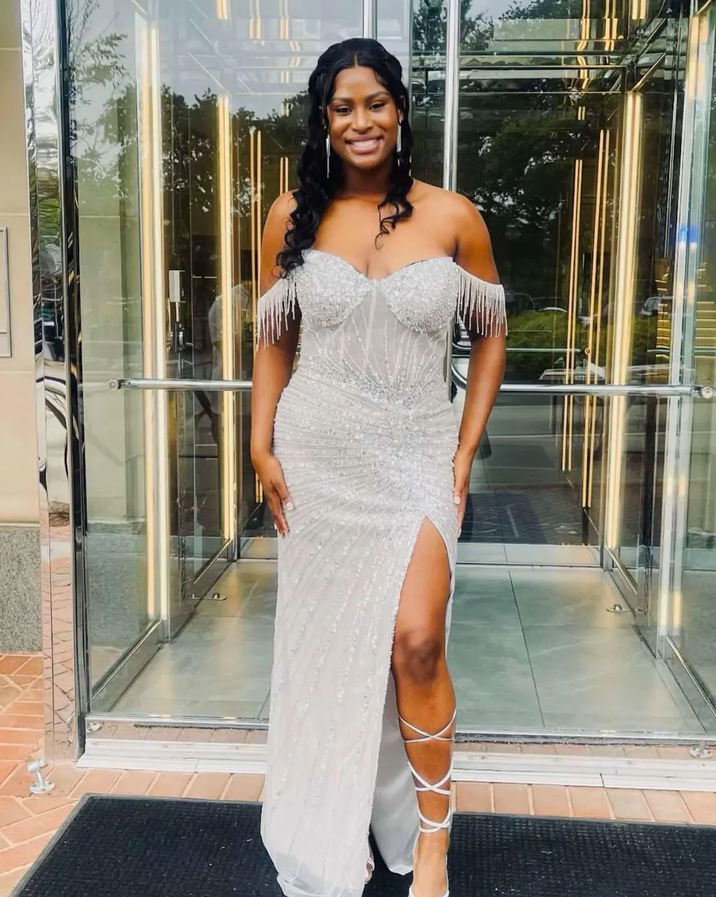 A woman wears the Ladivine CC324 Fringed Long Beaded Prom Dress—navy blue, off-the-shoulder, sequined with a thigh-high slit—paired with clear high-heeled sandals, standing against a plain background.